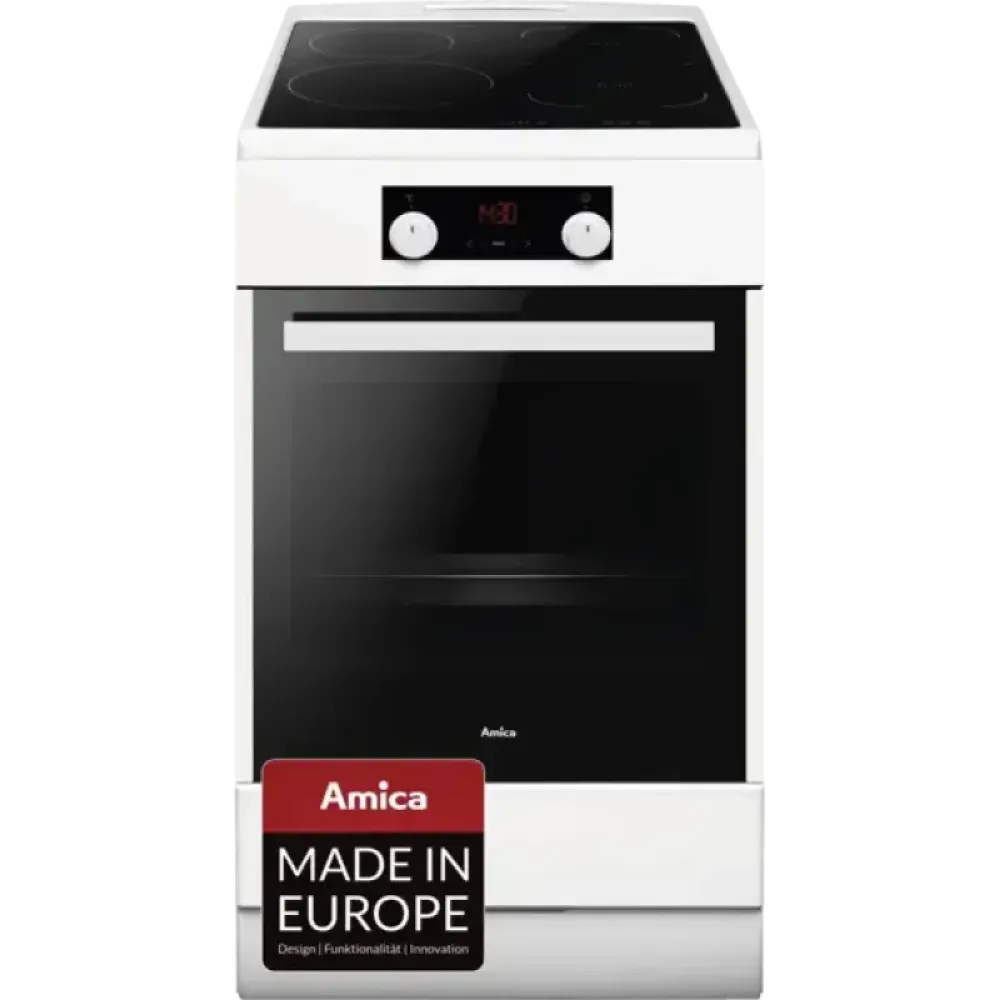 Freestanding cooker, electric oven, 65-litre capacity, rapid heating, Steam Clean function (easy cleaning with steam), oven door with soft-closing mechanism, front panel with heat protection, pull-out shelf for dishes, defrost function, ECO function, infrared grill, intensive grill (grill + top heat), intensive grill with top heat (grill + top heat + fan), convection, pizza mode, convection, pull-out control knobs, display, digital clock, timer, halogen lighting, glass ceramic hob, 4 induction zones, linking function (two zones can be combined into one larger zone), touch control, energy efficiency class A, width: 50 cm, height: 85 cm, depth: 60 cm