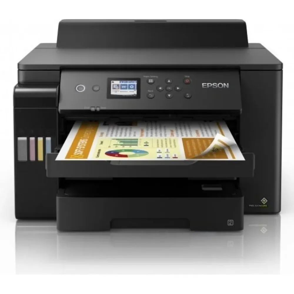 Epson L11160 is a cartridge-free printer capable of printing A3+ documents. It is specifically designed for those who need economical printing of various formats and extensive functionality, including Wi-Fi Direct and Ethernet connectivity. The package already includes a set of full-size ink containers. **Front Ink Tanks** A feature of all devices in the "Epson Print Factory" series is cartridge-free printing. Instead of cartridges, the Epson L11160 uses front ink tanks. The front placement of the tanks makes the device more compact and allows for easy monitoring of ink levels. **High Resource of Consumables** The volume of the ink containers for the Epson L11160 multifunction printer is 10 times greater than that of a standard cartridge, consisting of 70 ml of color ink and 127 ml of black ink. The ink set is designed for printing up to 7500 black and 6000 color pages. **High Print Speed** Thanks to the unique Epson PrecisionCore TFP4 print head, the Epson L11160 prints at speeds of up to 25 black and 25 color pages per minute according to ISO standards, significantly reducing printing time, which will be especially appreciated by users with high printing volumes. **Innovative Ink Filling System "Key Lock"** The "Key Lock" system prevents color mix-ups during refilling. The secret of the new filling system lies in the unique shape of the container spout, which is compatible only with the corresponding color filling hole, functioning like a key in a lock. **New Containers with Built-in Ink Shut-off Valve** The ink containers are equipped with an internal valve that protects against accidental spills when the container is turned upside down. The valve opens only when the container is installed in the filling hole, after which the ink begins to flow into the printing system. As soon as you remove the container from the filling hole, the valve blocks the ink flow, eliminating the possibility of accidental spills. **Pigment Inks in All Colors** When printing, the device uses unique Epson pigment inks that provide: - Clear text and graphics on plain paper; - Instant drying of prints; - Resistance to water and marker bleed-through. **Replaceable Waste Ink Container** The Epson L11160 is a business device designed for high printing loads. When the waste ink container is full, the user can easily replace it themselves without contacting a service center. **Wireless Connection via Wi-Fi** The main advantages of wireless printing are saving desk space and printing from anywhere in the home or office. Connect to any Wi-Fi-enabled device and take full advantage of wireless printing capabilities—print documents and photos remotely. **Ethernet Network Connection** The Epson L11160 can be connected to a network and is suitable for use with multiple PCs in an office. **Printing from Mobile Devices** Download and install one of the free Epson Connect service apps and print images from your mobile devices running iOS and Android. The service apps also allow you to send documents and photos for printing via email by specifying the assigned printer's email address (Email print). **Convenient Control with a 6.1 cm LCD Screen** Setting up a wireless Wi-Fi connection or connecting to mobile devices without using a PC is possible thanks to the convenient 6.8 cm touch LCD screen. Additionally, service commands such as checking and cleaning the nozzles can be initiated from the control panel. **Automatic Duplex Printing** The automatic duplex printing feature saves time and paper. Select this option in the driver menu and print documents at speeds of up to 21 pages per minute. **High Print Quality and Reliability** The unique Epson PrecisionCore printing technology and precise pressure control in the ink tanks ensure high-quality prints. Specially developed materials used in the creation of the device's components provide a long service life and uninterrupted printer operation. The Epson L11160 comes with a manufacturer's official warranty of 12 months or 150,000 prints.